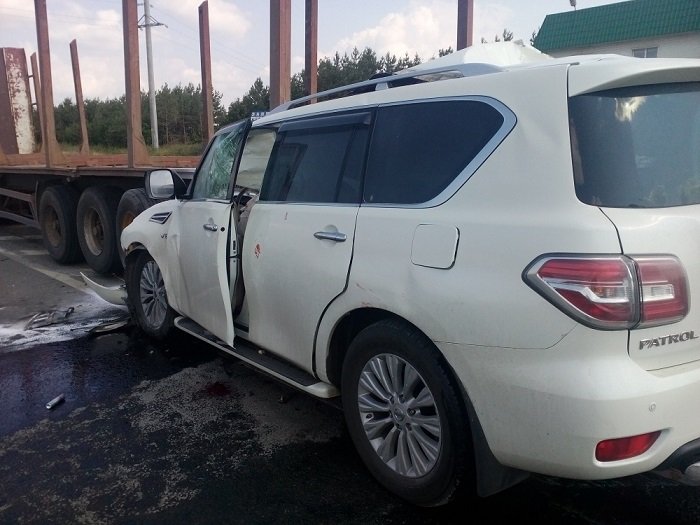 По предварительным данным, 52-летний водитель автомобиля Nissan Patrol задел грузовик MAN и, пытаясь скрыться с места ДТП, прибавил газу, но через 300 метров врезался в попутный лесовоз.