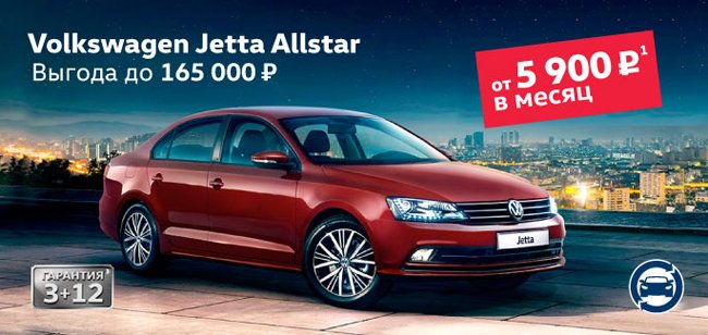 ***Ежемесячный платеж в сумме 5 900 рублей достигается при получении клиентом кредита по программе ООО «Фольксваген Банк РУС» (далее – «Банк») «VW Jetta Гарант» на покупку нового автомобиля Jetta Allstar 1.6 MPI 66 (90) 5-мех.стоимостью 1052000 рублей, на срок 36 месяцев, с первоначальным взносом 526070 рублей (50,01% от стоимости авто), остаточным платежом 420800 рублей (40% от стоимости авто) и процентной ставкой 7,5%* годовых при предоставлении полного пакета документов. Информация не является офертой Банка, расчет является приблизительным. Полная стоимость кредита и конкретные параметры кредита будут рассчитаны на основании Анкеты клиента, направляемой в Банк для одобрения кредитной заявки. *Указанная процентная ставка применяется для расчета платежей по кредиту при условии предоставления государственной субсидии на основании Постановления Правительства РФ №364 от 16.04.2015. и составляет разницу между стандартной процентной ставкой Банка для соответствующих условий кредитования и размером скидки равной двум третям ключевой ставки ЦБ РФ, действующей на дату выдачи кредита. Основные условия кредитования ООО «Фольксваген Банк РУС» (далее Банк) в рамках продукта «VW Jetta Гарант» на новые автомобили Volkswagen Jetta при предоставлении полного пакета документов: валюта кредита – рубли РФ; сумма кредита от 120 тыс. до 1,15 млн. рублей. Процентная ставка составит при сроке 36 месяцев – 14,5% годовых, при ПВ от 20%. Минимальный размер остаточного платежа составит 20% от стоимости автомобиля; максимальный размер остаточного платежа составит: при сроке 36 месяцев – 40% от стоимости автомобиля. Обеспечение по кредиту – залог приобретаемого автомобиля. Часть кредита может быть направлена на оплату страхования КАСКО и/или иных программ страхования, сумма страховой премии по которым зависит от перечня страхуемых рисков, выбранной Клиентом программы и суммы кредита. Условия предоставления кредита действительны на 01.08.2016г. и могут быть изменены Банком. Информация по телефону Банка: 8-800-700-75-57 (звонок по России бесплатный). Лицензия ЦБ РФ № 3500, 117485, г. Москва, ул. Обручева, д.30/1, стр.1. www.vwbank.ru.