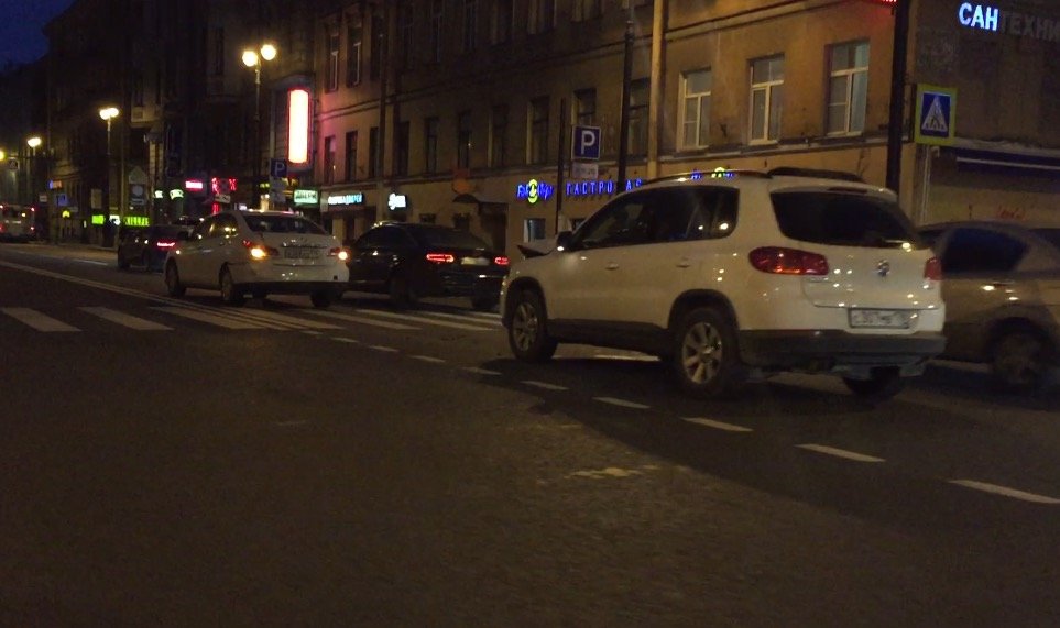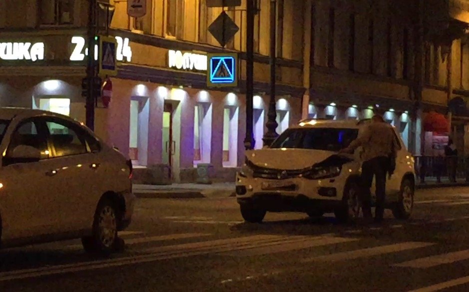 ДТП на улице Восстания - столкновение кроссовера "Фольксваген" и седана "Ниссан" неподалеку от пешеходного перехода. Судя по всему водителю "ниссана" пришлось резко затормозить перед вышедшим на проезжую часть пешеходом или осбакой, на что не успел среагировать водитель ехавшего следом за "Ниссаном", кроссовера "Фольксваген Тигуан".