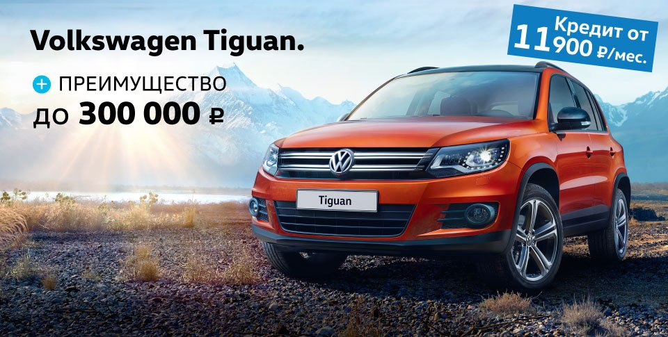 *Преимущество 300 000 руб. достигается при покупке Volkswagen Tiguan в специальной комплектации Avenue (Авеню) по программе утилизации. Сроки акции – до 30.09.2016 г. Количество автомобилей ограничено. Подробности узнавайте в отделе продаж.