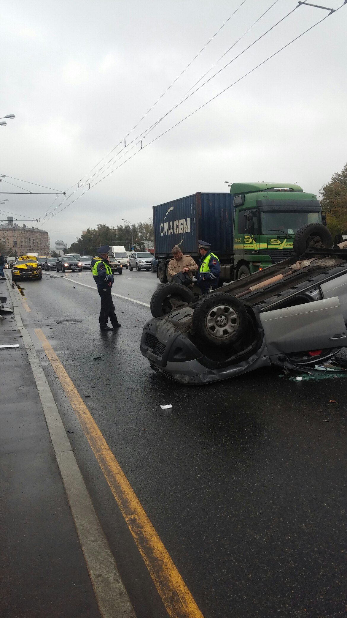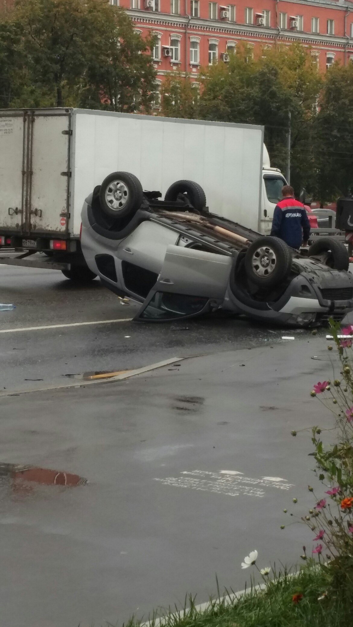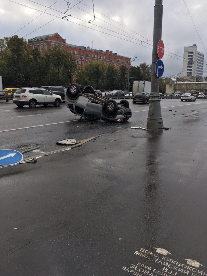 Серьезная авария произошла сегодня, 21 сентября, около 9 часов утра на Варшавском шоссе в районе дома № 16 в Москве. При столкновении двух автомобилей, один из них перевернулся на крышу.
