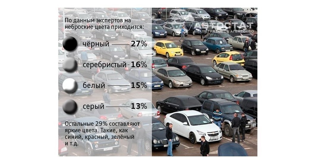 На первом месте среди цветовых решений – черный цвет. На него приходится 27% от указанного выше количества автомобилей. Примерно 16% - это серебристые машины, 15% — белые и 13% — серые. Оставшиеся 29% — это цветные автомобили: красные, зеленые, синие и т.п.