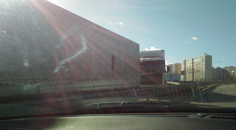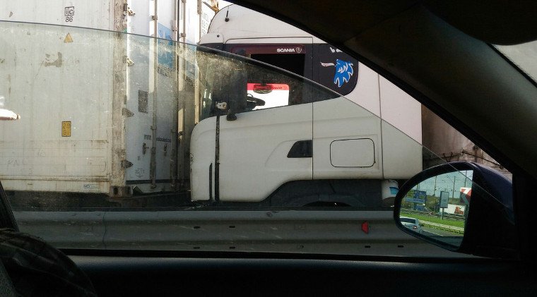 Сообщается, что на 65 километре (съезд №1 с внутреннего кольца КАД) столкнулись три грузовика и один легковой автомобиль. Очевидцы описывают: