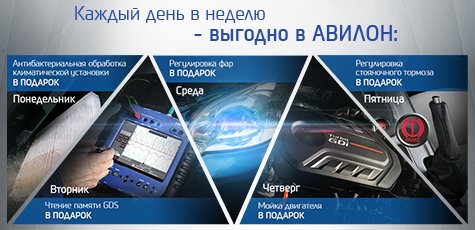 *Реклама. Не является публичной офертой. Акция действует при выполнении ТО в полном объеме, согласно регламенту, с применением запасных частей и расходным материалов, приобретенных в Авилон. Предложение ограничено, действительно до 30.09.2016. Скидка не суммируется со скидкой карты клиента, а также со специальными предложениями на запасные части и работы.