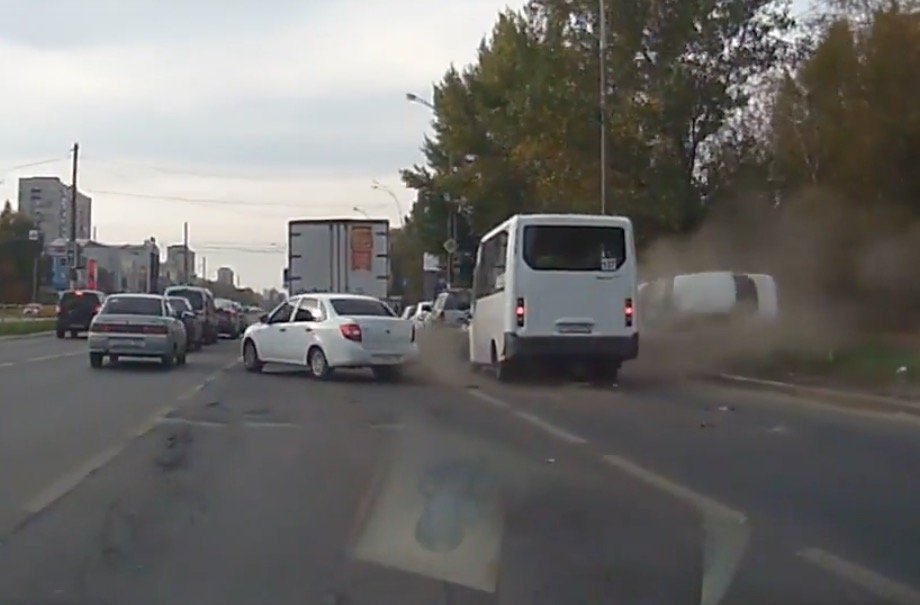Скоростной обгон справа с наездом на маршрутку и опрокидыванием в Тольятти