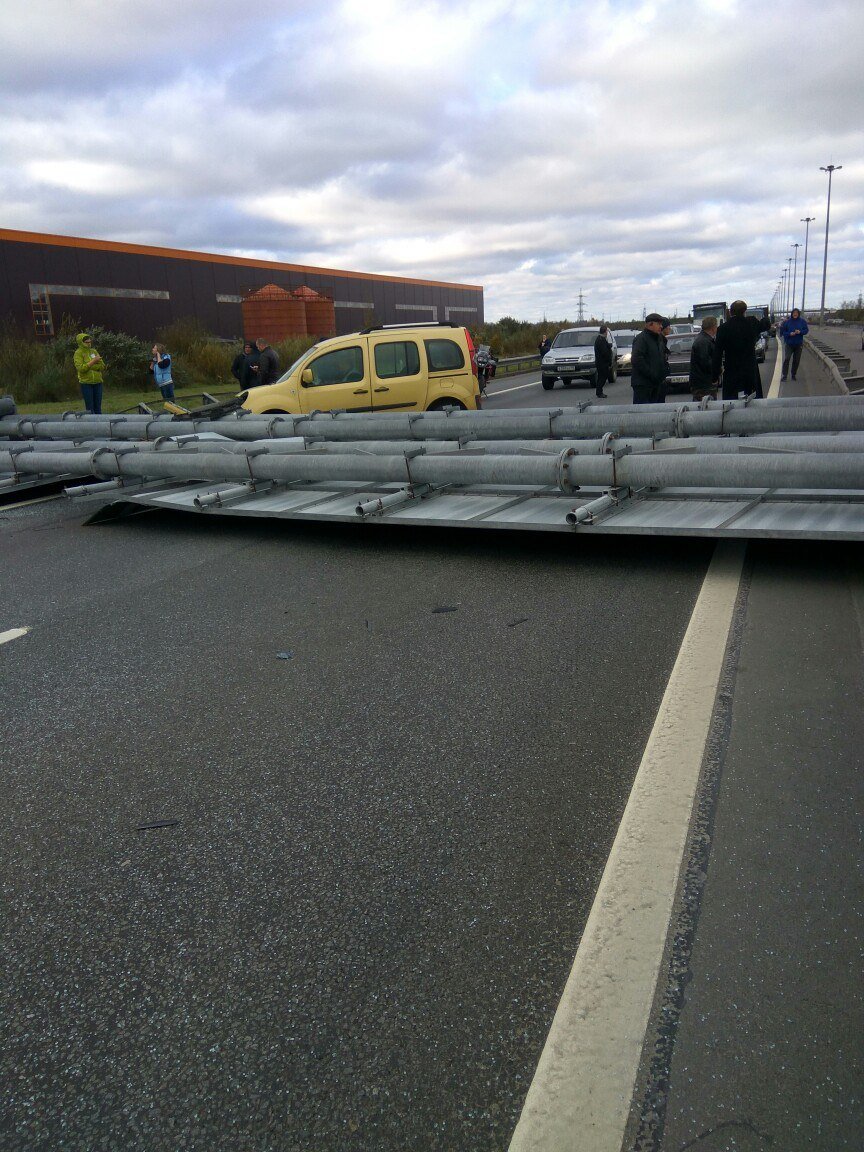 Из-за ветра на КАД упала металлическая опора, перекрыв движение
