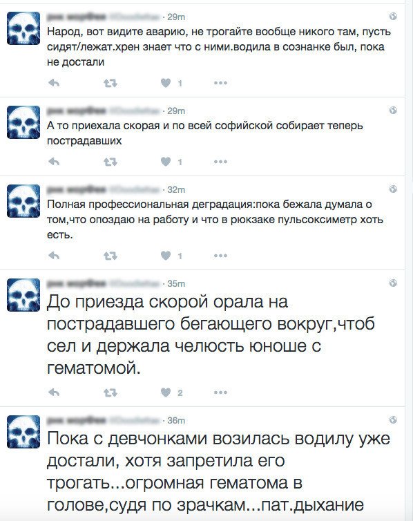 «Один на адреналине с амнезией носится около машины, двух девушек до меня успели достать — уложила. Чтоб не трогали, поставила над ними мужиков, — написала врач. — Стоят наблюдают, дышат ли, не дают уснуть, разговаривают с ними. Пока с девчонками возилась, водилу уже достали, хотя запретила его трогать... Огромная гематома в голове, судя по зрачкам... Пат. Дыхание».