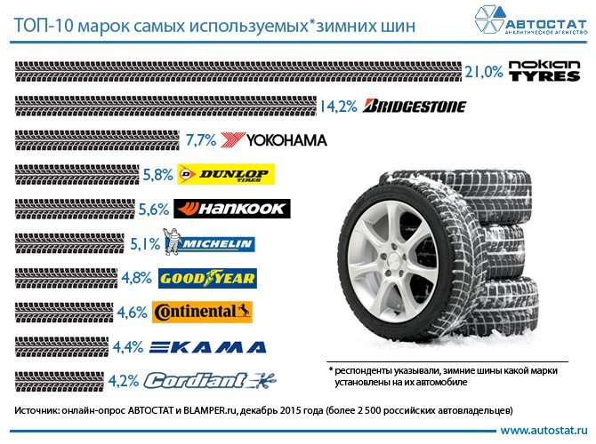 В декабре прошлого года аналитическое агентство «АВТОСТАТ» и сайт BLAMPER.ru провели онлайн-опрос, позволивший выяснить, какую именно марку зимних шин российские автолюбители предпочитают ставить на свои машины.