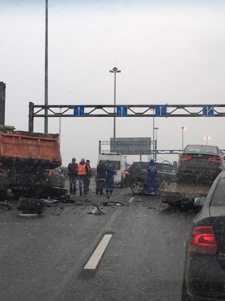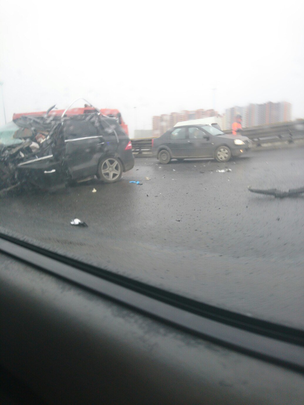 Из-за ДТП 3 полосы оказались перекрыты, движение транспорта осуществляется только по правой полосе.