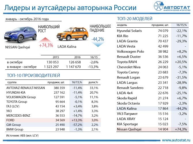 Сильнее всего выросли продажи у компании Ford: +13,3% в январе - октябре 2016 года. Наибольшее снижение продаж по итогам десяти месяцев отмечено у GM Group (-57,2%).