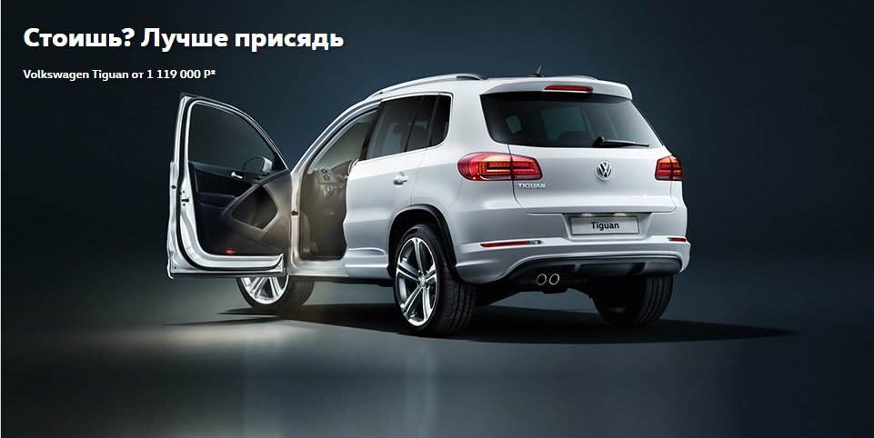 ** Указанное преимущество достигается при покупке автомобиля VW Tiguan 2016 года выпуска у официального дилера в период с 01.11.2016 по 31.12.2016 за счет предоставления дилером специальной цены, а также за счет предоставления скидки за сдачу предыдущего автомобиля в зачет стоимости нового (трейд-ин). Предложение действительно при условии, что сдаваемый в трейд-ин автомобиль был в собственности покупателя не менее 6 месяцев к моменту сдачи. Предложение ограничено. В акции принимают участие не все дилерские центры. Подробности узнавайте в отделах продаж официальных дилеров Volkswagen.