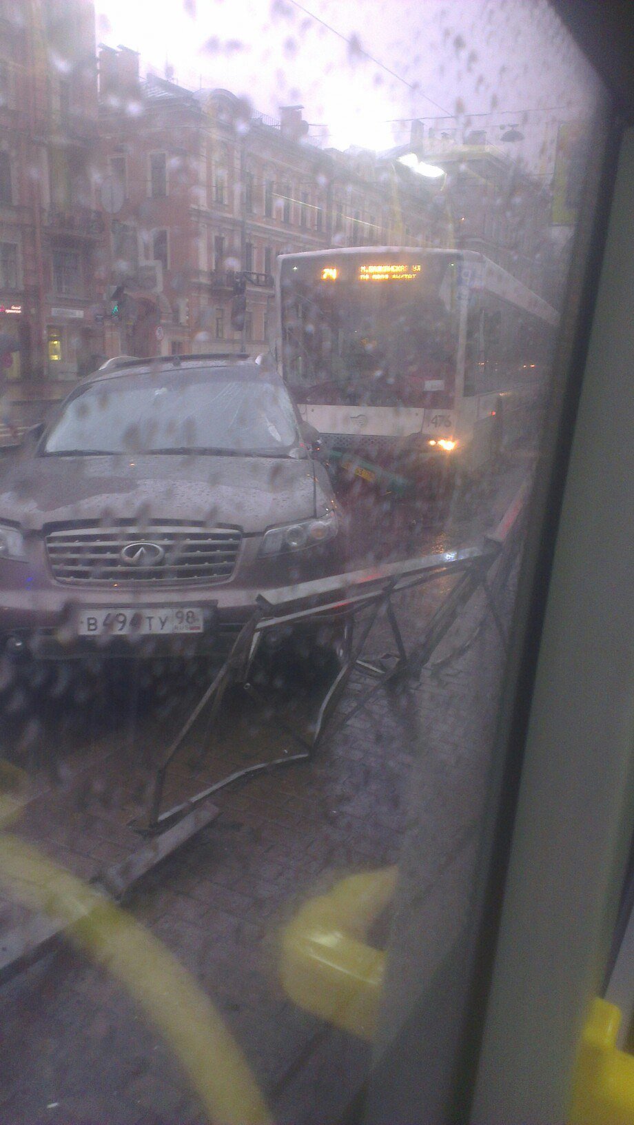 Буквально позавчера произошла подобная авария, когда столкнулись автобус №74 и две легковушки. Сегодня автобус того же маршрута столкнуля с автомобилем Infinity на том же месте.