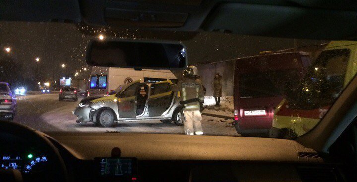 Сообщается, что на дороге столкнулись легковушка «Рено Логан» и фургон «Форд Транзит». По словам свидетелей, легковушка является автомобилем такси.