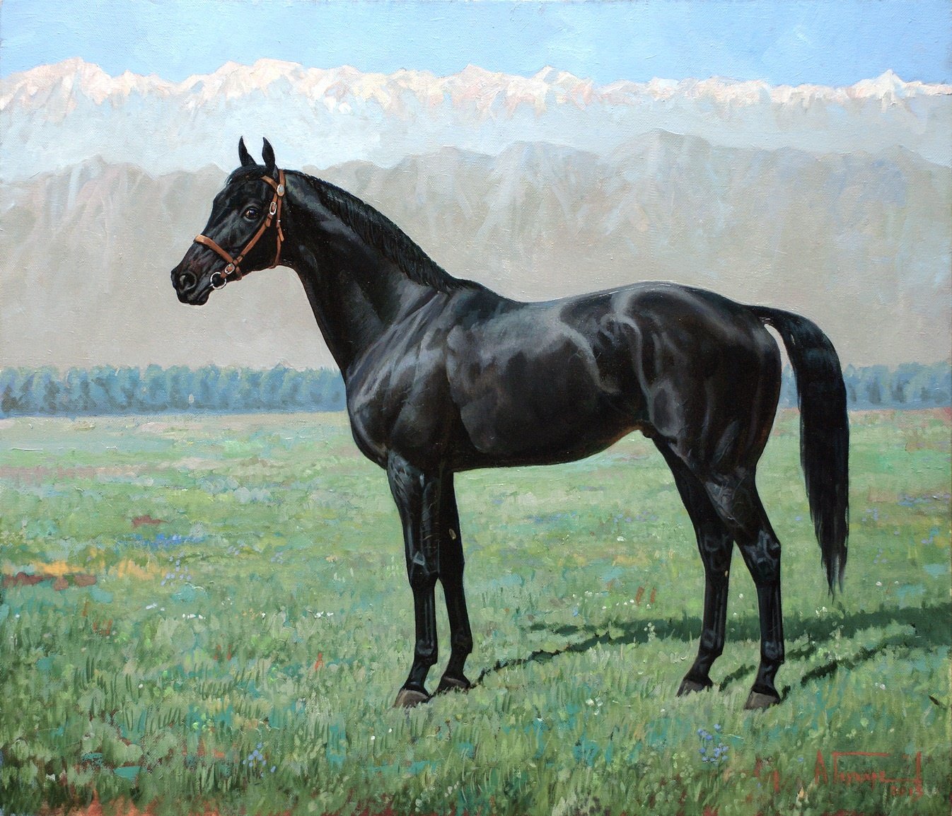 На экспозиции представлено 6 полотен, на которых изображены лошади чистокровных пород.