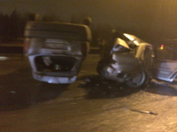 По предварительным данным, на большой скорости столкнулись два автомобиля – Mercedes и SsangYong (по некоторым данным, Renault). От удара второй автомобиль перевернулся на крышу.