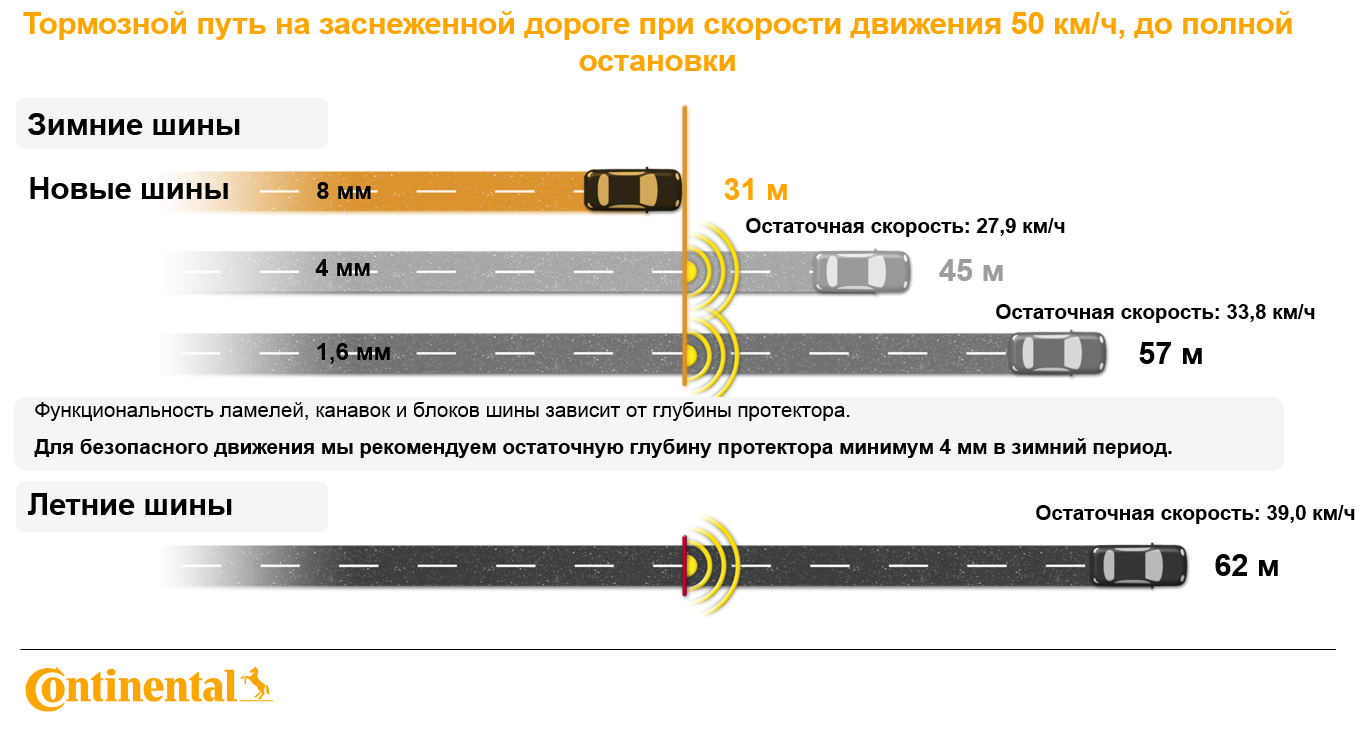 Continental напоминает, что если вы используете не новые зимние шины - убедитесь, что глубина их протектора составляет от 4 мм. Это минимум, при котором на зимней дороге резина будет работать все еще эффективно.