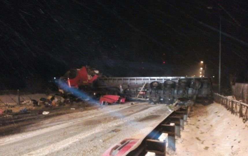 По предварительным данным, водитель легкового автомобиля Hyundai, предположительно, в состоянии алкогольного опьянения, врезался на большой скорости в фуру, которая перевозила металлоконструкции. Грузовик опрокинулся на бок, придавив легковушку.