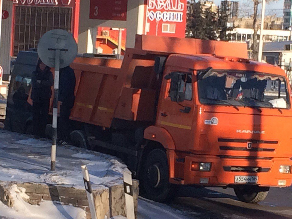Сообщается, что микроавтобус с пассажирами, следовавший по маршруту №21, врезался в стоявший на светофоре самосвал КамАЗ.