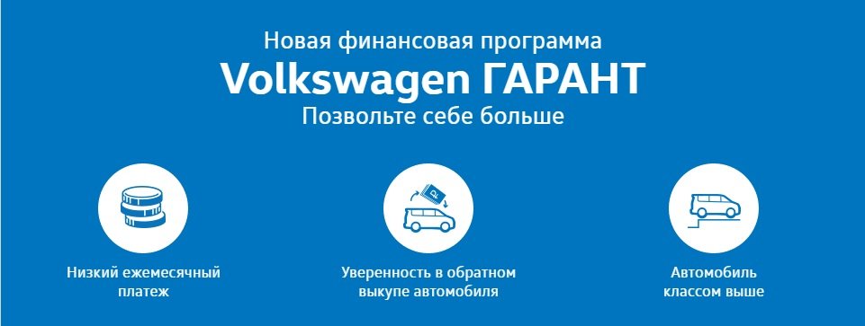 Кредит Volkswagen ГАРАНТ – это возможность выкупа Вашего Volkswagen дилерским предприятием в конце срока кредита по заранее определенной стоимости. Вне зависимости от рыночных условий Вы всегда можете быть уверены в стоимости вашего автомобиля по окончании предусмотренного срока кредита. А в конце срока кредита у Вас есть возможность реализовать автомобиль дилеру или сдать в trade-in (трейд-ин) и приобрести новую модель Volkswagen, используя средства от выкупа авто в качестве первоначального взноса.