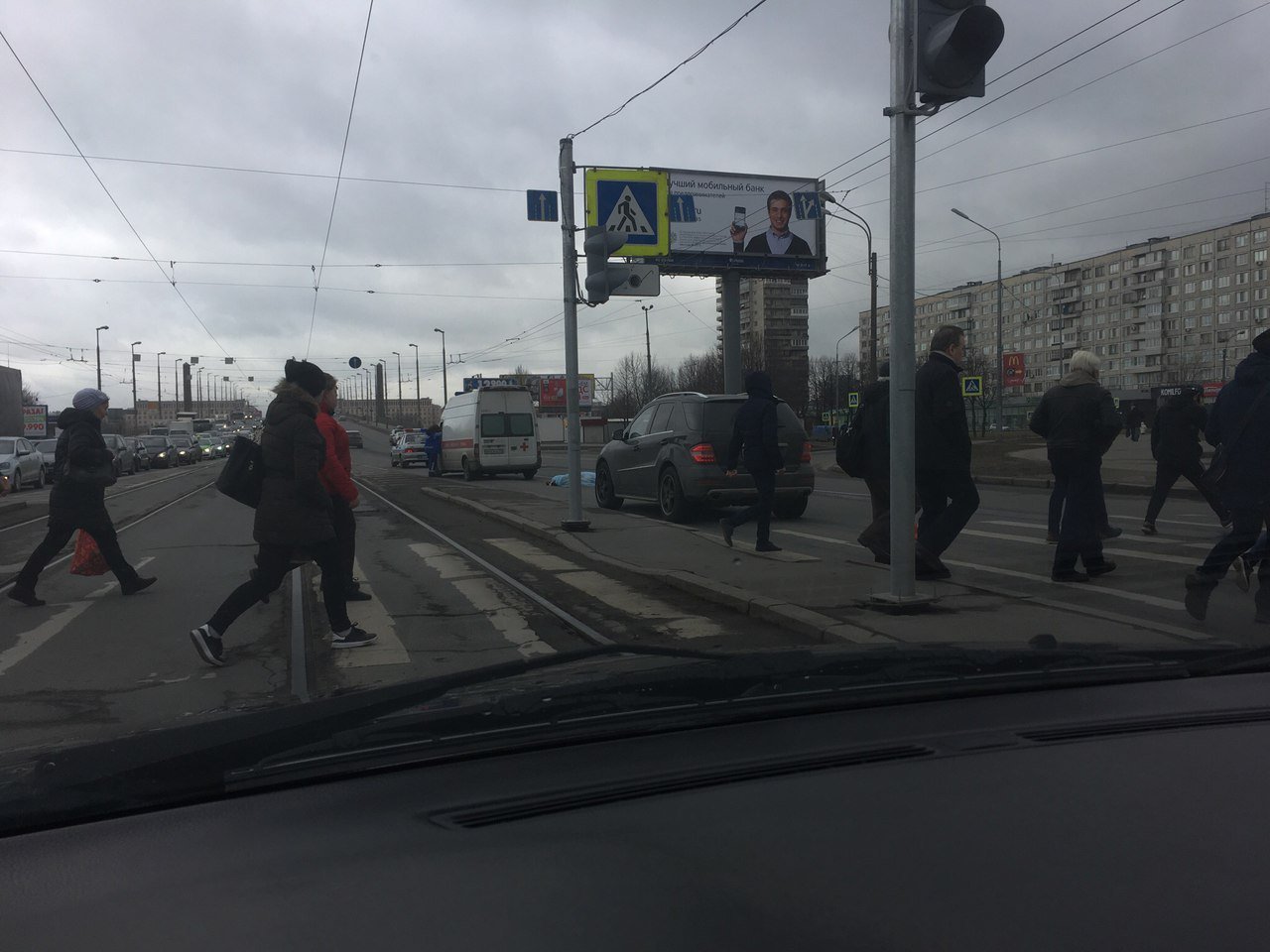 По словам очевидцев, автомобиль Mercedes сбил мужчину лет 50-60 лет на вид, переходившего проезжую часть по пешеходному переходу. Правда, на какой именно свет светофора это происходило, пока неясно. Одни свидетели говорят, что на зеленый, другие утверждают, что на красный.