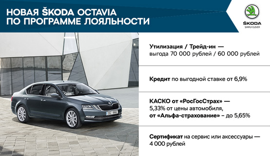 Для участников программы при покупке новой SKODA OCTAVIA отныне действует широкий пакет специальных предложений. Это уникальная возможность приобрести новинку по выгодной цене на старте продаж. Привлекательные условия распространяются на участие в программах Утилизация/Трейд-ин, приобретение автомобиля в кредит или за наличный расчет и страхование автомобиля. Фирменные подарки от SKODA ждут также новых клиентов марки.