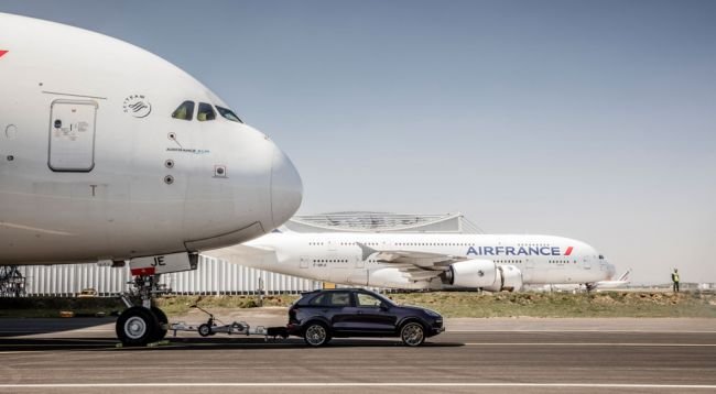 Производитель автомобилей Porsche совместно с авиакомпанией Air France пригласили в парижский аэропорт Шарль-де-Голль экспертов Книги Рекордов Гиннесса, чтобы запечатлеть новый рекорд. Стандартный Porsche Cayenne S Diesel с помощью фаркопа отбуксировал из ангара двухэтажный 285-тонный самолет Airbus A380.