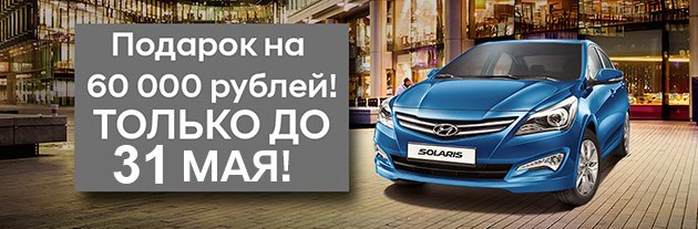 Только до 31 мая 2017 года, покупая автомобиль Solaris у официального дилера Hyundai АКРОС, в подарок вы получаете необходимое оборудование стоимостью до 60 000 рублей!