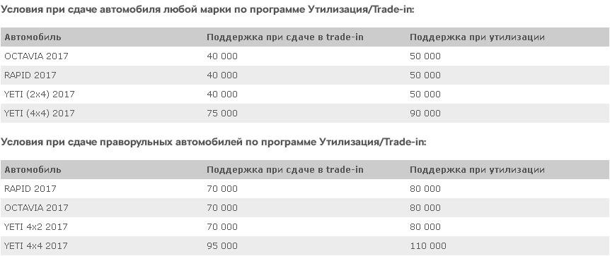 Акция распространяется на автомобили RAPID (CKD), OCTAVIA (CKD) и YETI (CKD), переданные клиентам в период действия акции;размер поддержки 40 000 руб. для автомобилей RAPID, OCTAVIA, YETI (2x4) 2017 года выпуска предоставляется в случае сдачи в trade-in автомобиля любой марки;размер поддержки 50 000 руб. для автомобилей RAPID, OCTAVIA, YETI (2x4) 2017 года выпуска предоставляется в случае сдачи в утилизацию автомобиля любой марки;размер поддержки 75 000 руб. для автомобилей YETI (4x4) 2017 года в случае сдачи в trade-in автомобиля любой марки;размер поддержки 90 000 руб. для автомобилей YETI (4x4) 2017 года в случае сдачи в утилизацию автомобиля любой марки.