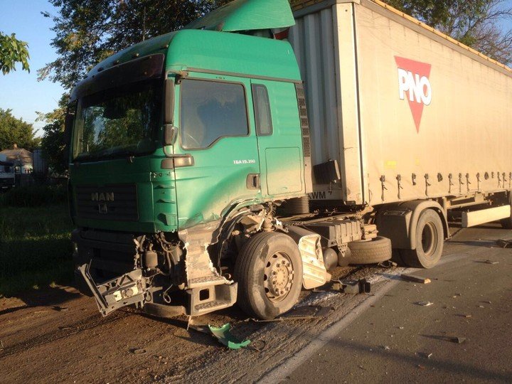По предварительным данным, водитель бензовоза МАЗ не выдержал боковой интервал и столкнулся с попутным грузовиком MAN.