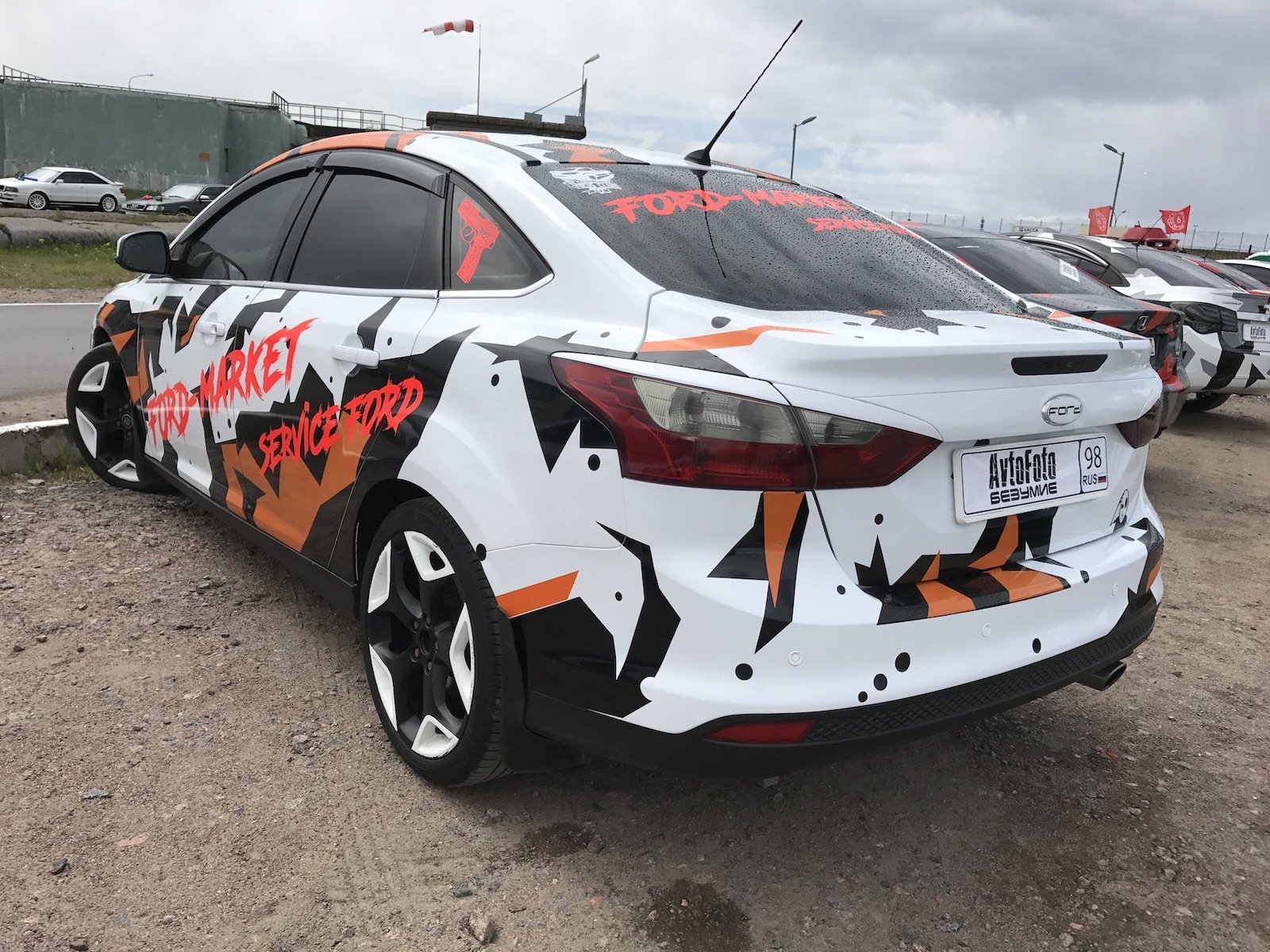 На въезде на территорию фестиваля «АвтоФотоБезумие» посетителей встречала целая грядка пятнисто-раскрашенных машин в дизайне Ford Market.
