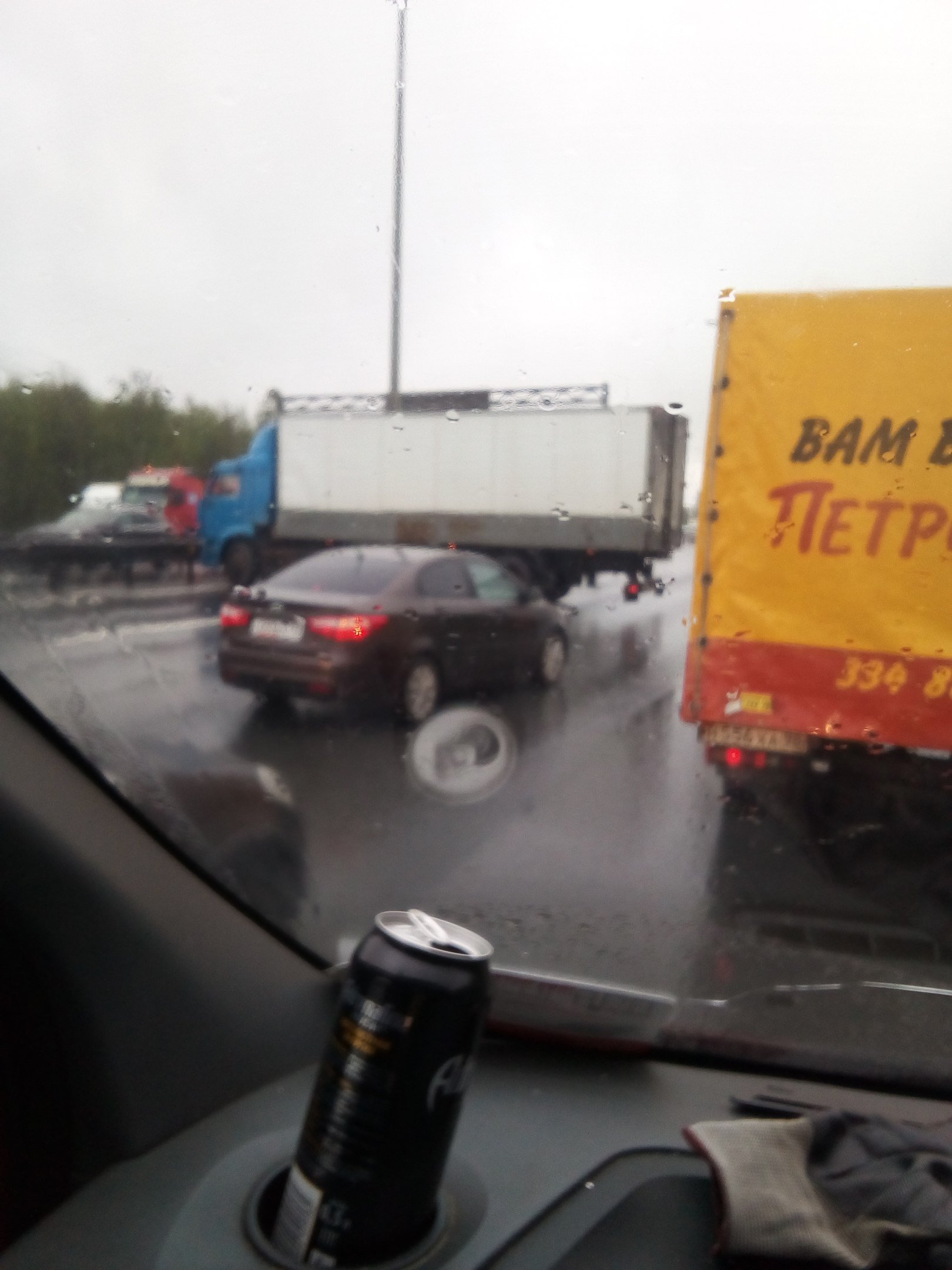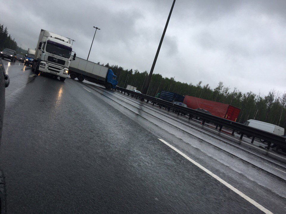 На КАД в Петербурге грузовик перекрыл три полосы движения на внутреннем кольце после Колтушей.