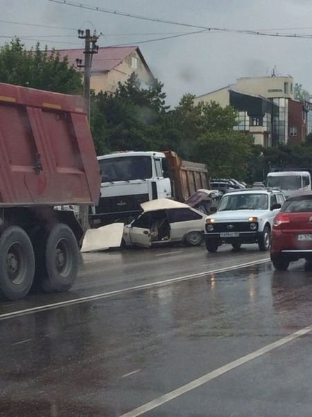 «Ялтинская объездная, разворот карманный, возле Консоль, Маз раздавил ВАЗ-2108. Водитель легковушки жив, скорая оказывает помощь! Маз груженый, водитель ВАЗа исходя из места положения ДТП, осуществил разворот через сплошные, не доезжая до разворота 15 м».