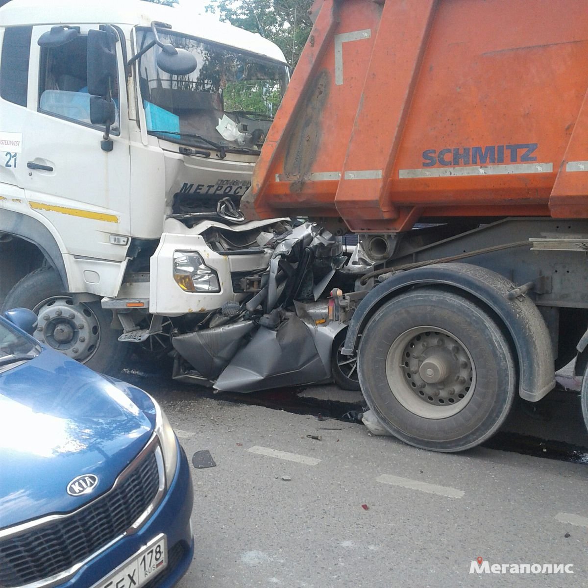 По сообщениям очевидцев, легковой автомобиль был раздавлен двумя грузовиками. На фото даже тяжело разглядеть искореженную легковушку. По предварительным данным, в результате ДТП погибли люди.