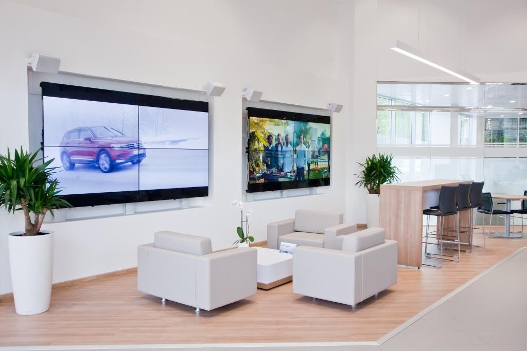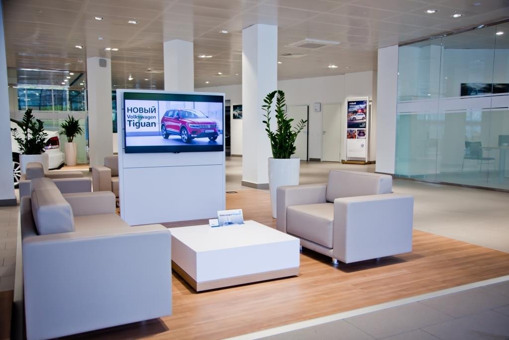 В новом концепте шоу-рума Volkswagen цифровая техника и удобные кресла и диваны вытесняют привычные столы переговоров. В комфортных зонах для консультаций с широкоформатными экранами высокой четкости клиент может получить всю необходимую информацию вплоть до момента заключения договора. В центре внимания – зона конфигуратора автомобиля, оснащенная современной бесшовной видеостеной HD формата. С ее помощью подбор автомобиля, выбор цвета, комплектации и опций становится более ярким и эмоциональным. Не вставая с уютного кресла, клиент может увидеть и сравнить несколько предлагаемых вариантов комплектации, уточнить информацию о принципиальных опциях, ценах и сроках поставки автомобиля. Для покупателя новый процесс покупки более комфортен и нагляден, чем физический осмотр различных автомобилей, особенно при неблагоприятных погодных условиях. Готовое предложение клиент получает по электронной почте вместе с дополнительным медиа-контентом, который был использован в процессе консультации в шоу-руме.