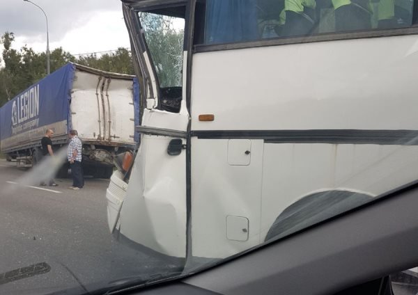 По сообщениям очевидцев, на дороге столкнулись пассажирский автобус Setra и грузовой КамАЗ.