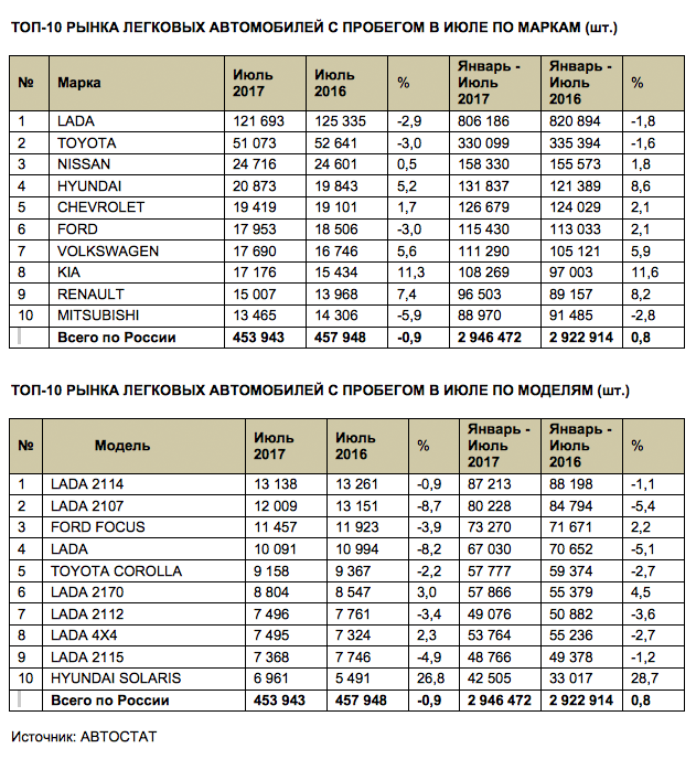 27% от всех сделок купли-продажи на рынке авто с пробегом в июле пришлось на автомобили «Лада». Это 121,7 тыс. продаж – на 2,9% меньше, чем год назад. Лучшей среди иномарок в этом плане остается Toyota - их продано за июль 51,1 тыс. экземпляров.