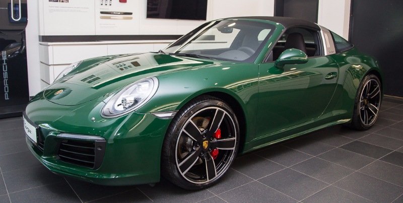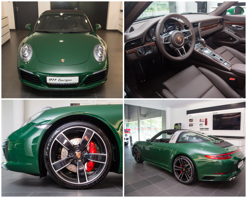 Porsche 911 Targa 4S.Это высокохудожественная реплика юбилейного автомобиля 911.Он также окрашен в эксклюзивный цвет Irish Green.Кожаный салон исполнен в цвете Espresso и отделан деревянными вставками. Легко узнаваемый облик дополняют 20-дюймовые легкосплавные диски Fuchs.В каждой детали чувствуется подчеркнутая индивидуальность, даже его ключ окрашен в цвет кузова автомобиля.