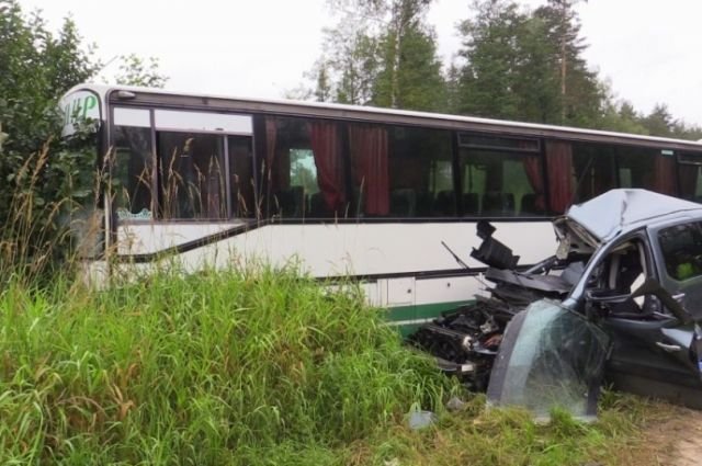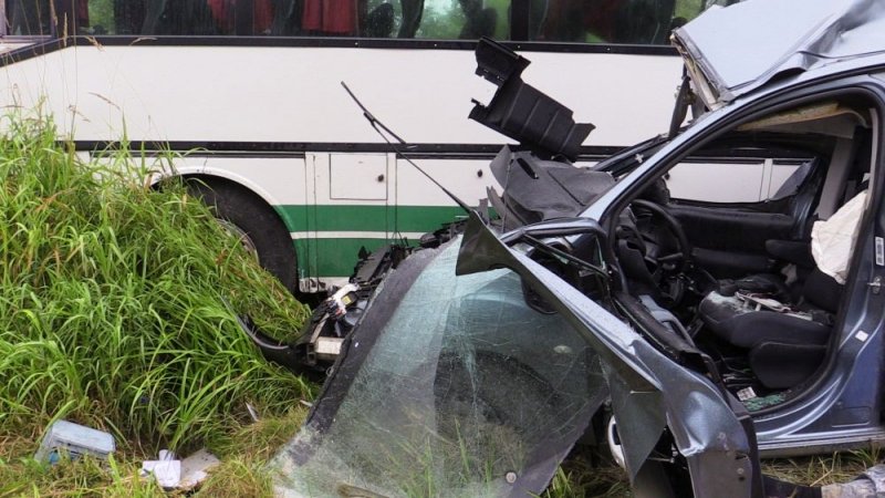 В результате аварии водитель легкового автомобиля погиб на месте. 50-летняя пассажирка автобуса получила не серьезные травмы.