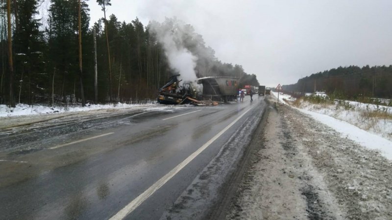 По предварительным данным, водитель тягача Renault с полуприцепом, двигаясь со стороны Ханты-Мансийск без груза, превысил скорость, из-за чего полуприцеп вынесло на полосу встречного движения, где он столкнулся с другим тягачом с полуприцепом – Volvo. От удара Volvo загорелся.