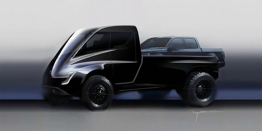 Компания Tesla показала эскиз огромного электрического пикапа, способного перевезти даже другой автомобиль.