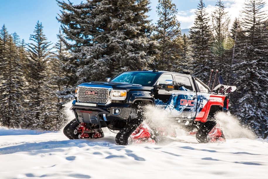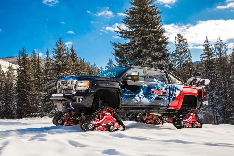 Марка GMC представила пикап Sierra, оснащенный гусеничными платформами Mattracks. Новинка создана для передвижения по бездорожью и глубокому снегу в горах.