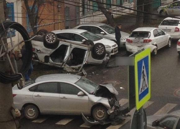Автомобиль перевернулся на крышу после ДТП сегодня, 18 декабря, в 14:30 на пересечении улиц Чапаева и Фрунзе в Краснодаре.