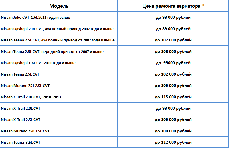 В данной таблице указаны цены на ремонт вариатора в зависимости от модели вашего автомобиля: