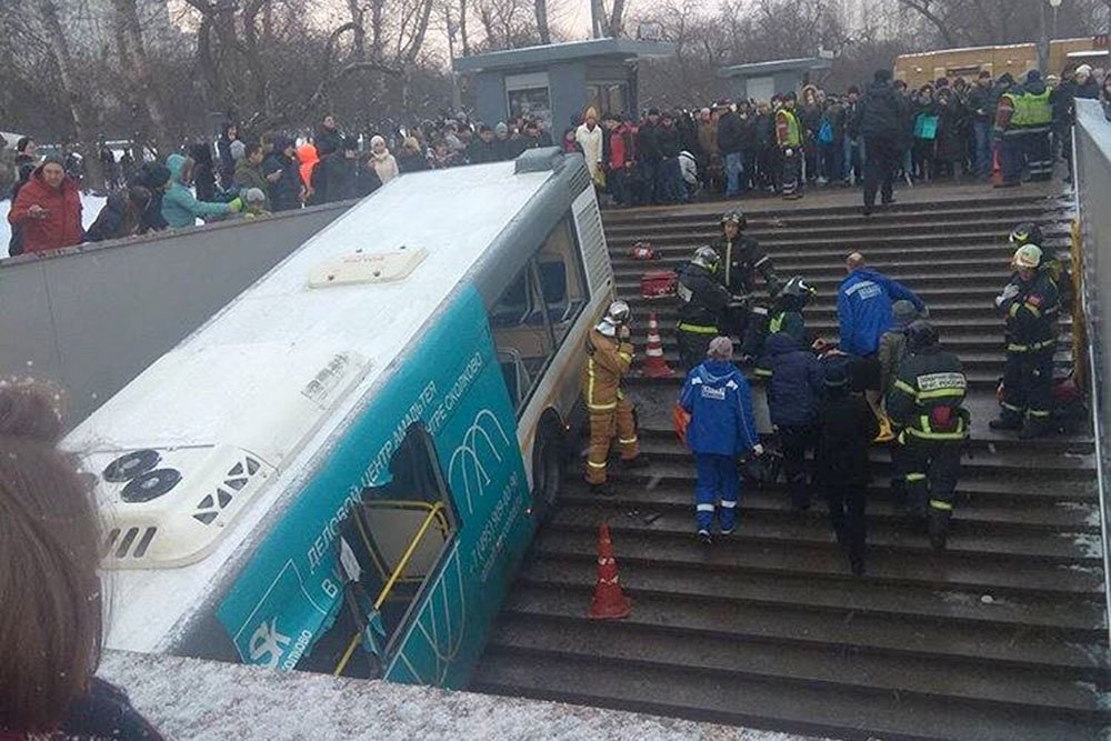 Водитель автобуса, принадлежащего компании «Мострансавто», допустил съезд транспортного средства в подземный пешеходный переход. В результате аварии, погибли 4 человек, пострадали — 15. Водитель автобуса задержан, пострадавшим оказывается помощь. На место аварии вылетели три вертолета Московского авиационного центра.