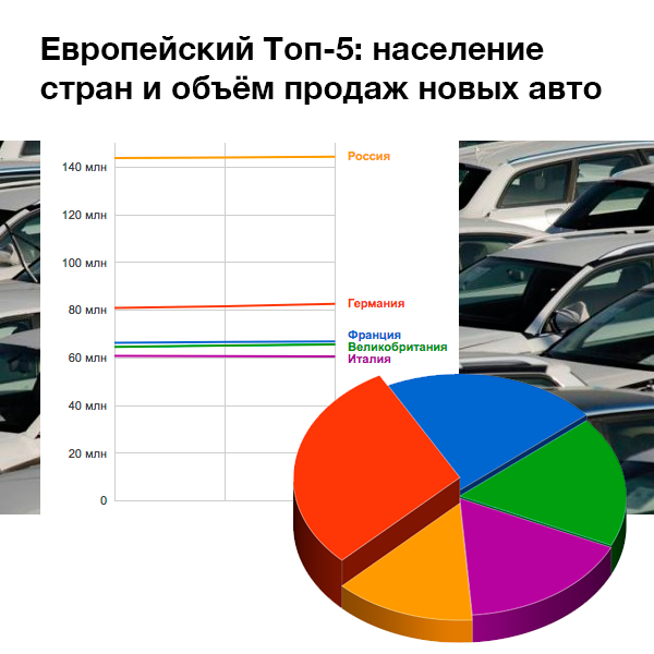 Россия замыкает европейский Топ-5 по объёмам продаж новых автомобилей. Интересно, что в пятёрку лидеров входят самые большие по размеру населения страны в Европе, правда, не совсем пропорционально. Самая многочисленная страна как раз находится в конце этого короткого списка.