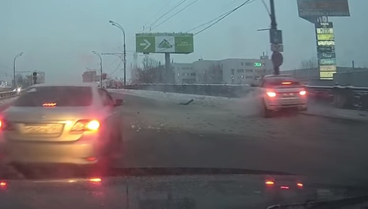 На видео, попавшем в Сеть видно, как автомобиль Range Rover занесло в сугроб около дороги, где в это время шли пешеходы, после чего машина врезалась в мачту городского освещения.