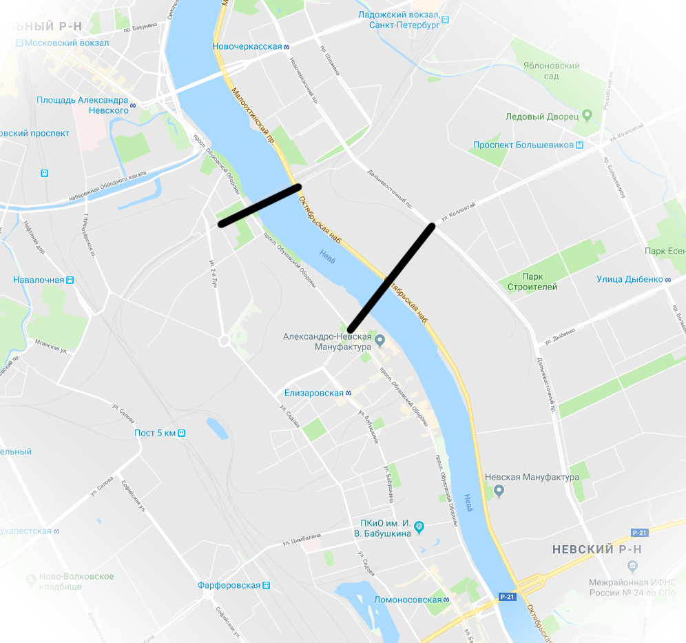 Оба моста появятся в Невском районе - в промежутке между мостом Александра Невского и Володарским мостом. Один из мостов будет разводным, так что количество достопримечательностей для туристов в этой части города увеличится. Речь об участке, который по правой стороне Невы обозначен как створ ул. Коллонтай - на другой стороне мост выйдет к Большому Смоленскому проспекту.
