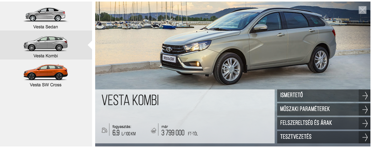 Например, на венгерском сайте российской компании Vesta Kombi (такое название тут получила обычная версия универсала) в минимальной комплектации Comfort за 3 799 000 форинтов. А та же Dacia Logan MCV в топовой комплектации Stepway предлагается по цене от 3 319 000 форинтов.