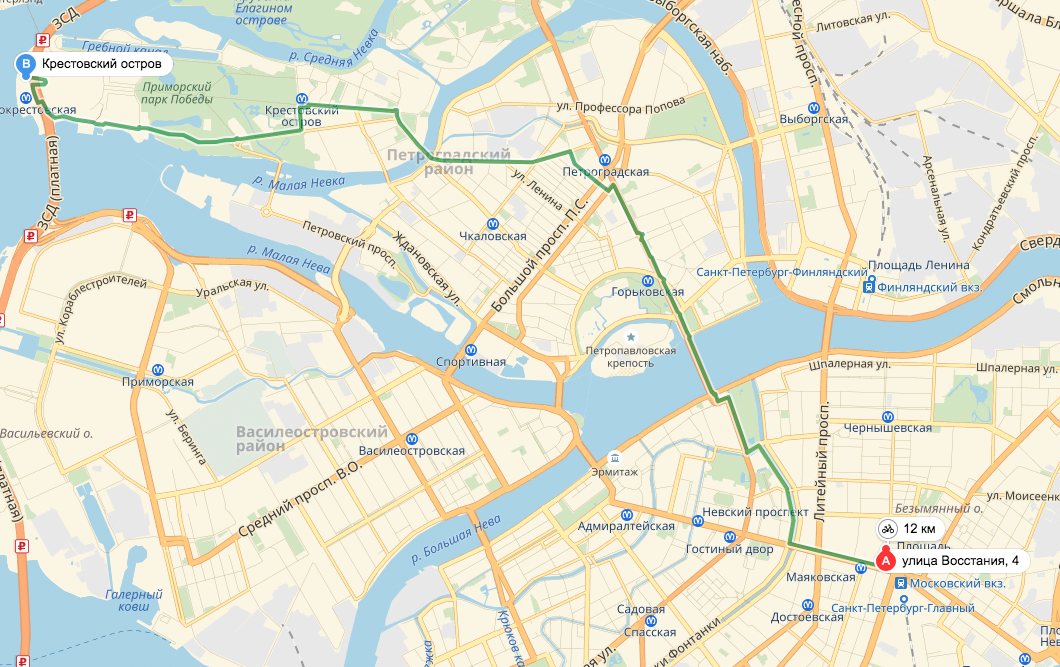 "Яндекс.Карты" вот так предлагают ехать от Московского вокзала до стадиона на Крестовском острове. Санкт-Петербург.