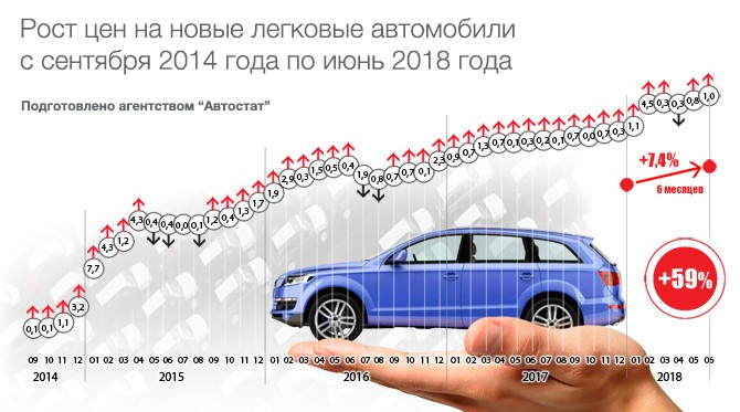 так же интересно отметить, что в итоге менее чем за 4 года средняя стоимость новых легковушек в России поднялась более чем на половину. С сентября 2014 года автомобили в России подорожали на 59%.